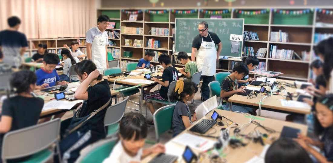 強い日差しと暑さの残る10月1日、花岡小学校「家庭と学校をつなぐ会」でプログラミング教室を開催しました。